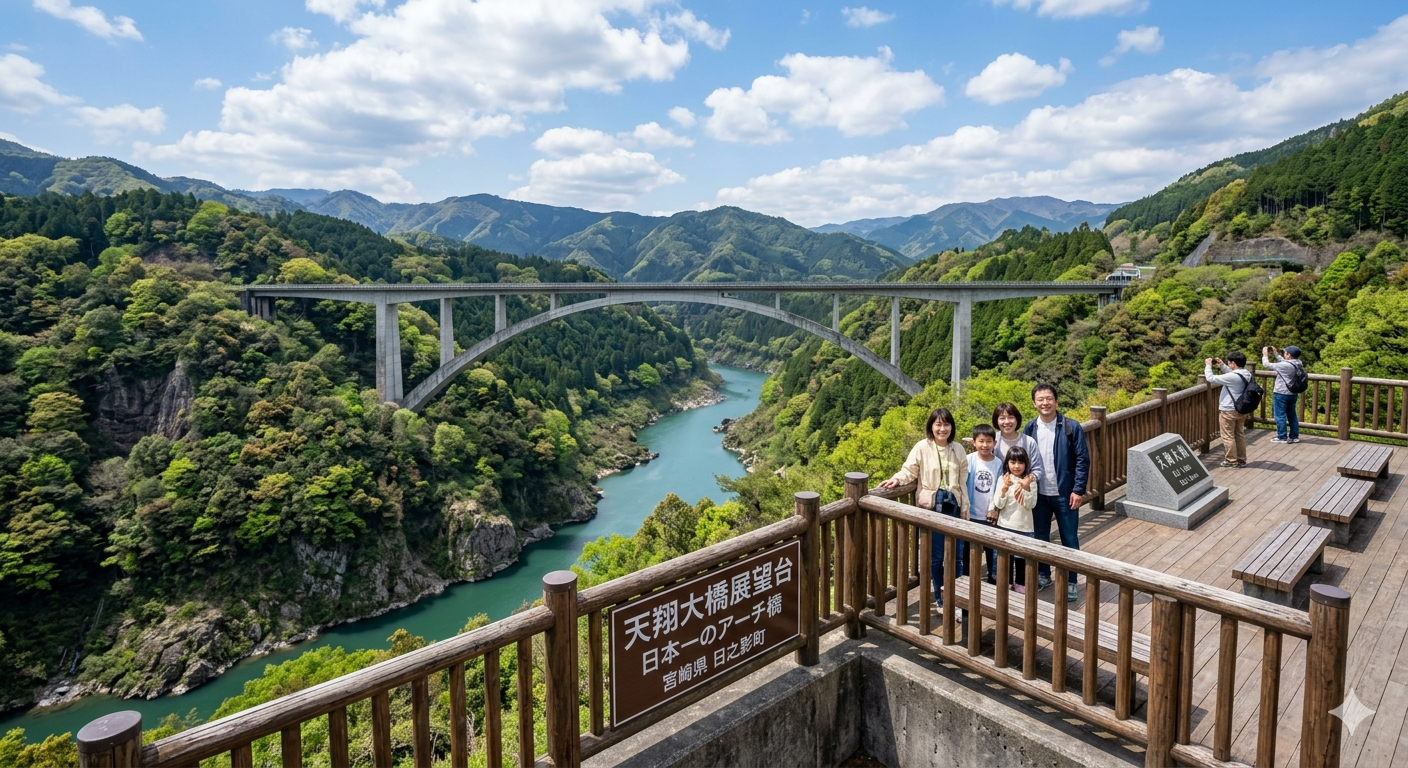 眼前に広がるのは、コンクリートアーチ橋として日本最大の長さを誇る天翔大橋。五ヶ瀬川の深い渓谷をひと跨ぎにするその姿は、まさに空を翔ける龍のような雄大さです。